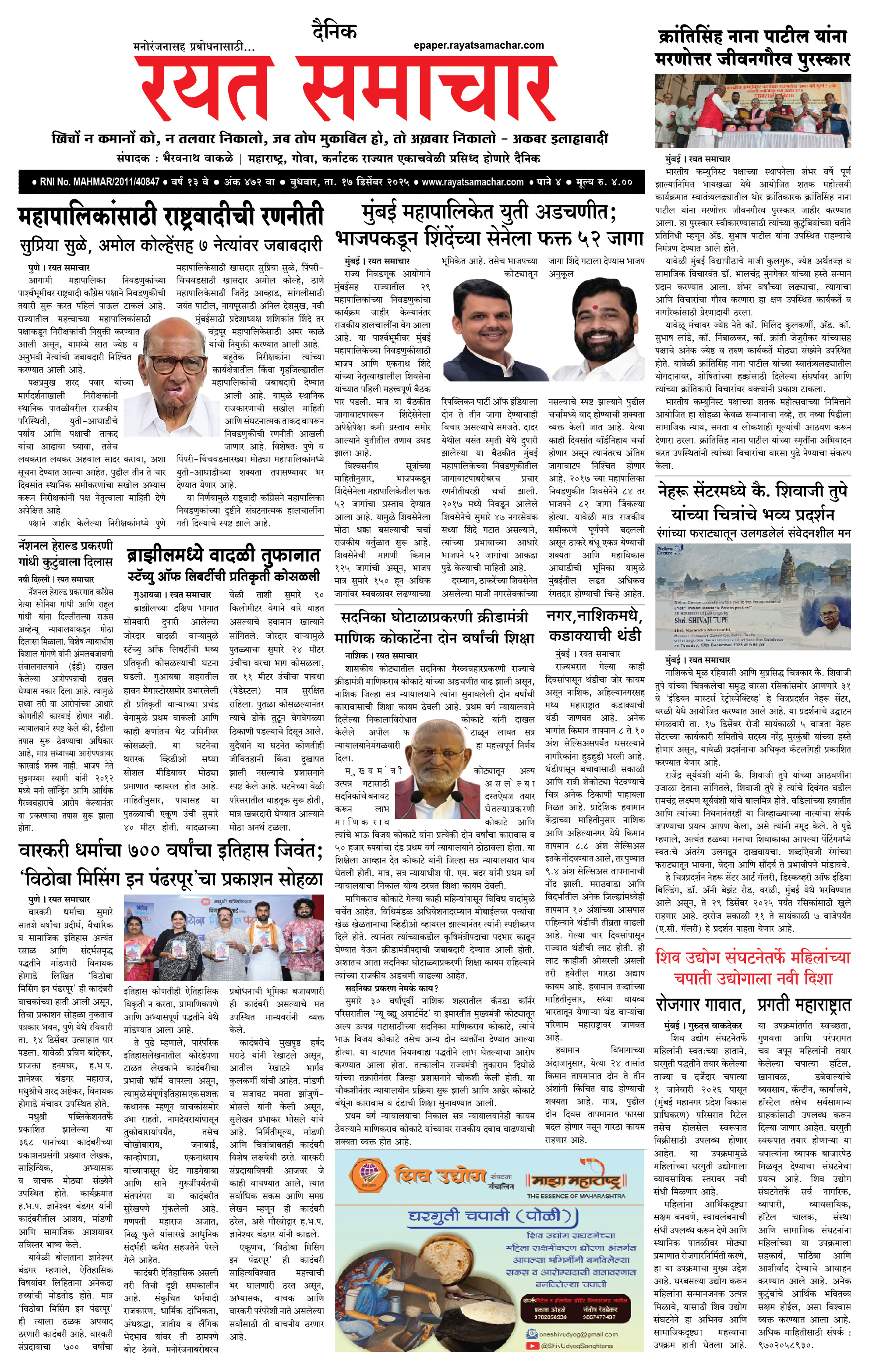 RSE: आजचा रयत समाचार वाचा 17 Dec 2025 मनोरंजनासह प्रबोधनासाठी... December 17, 2025 << First << 1 2 3 4 >> Last >> Page 1Page 2Page 3Page 4 × RSE: आजचा रयत समाचार वाचा 17 Dec 2025 मनोरंजनासह प्रबोधनासाठी... 1_MAIN PAGE2_CITY PAGE3_DISTRICT_PAGE4_MAHARSHTRA_PAGE Full PDF << First << 1 >> Last >> 1_MAIN PAGE2_CITY PAGE3_DISTRICT_PAGE4_MAHARSHTRA_PAGE