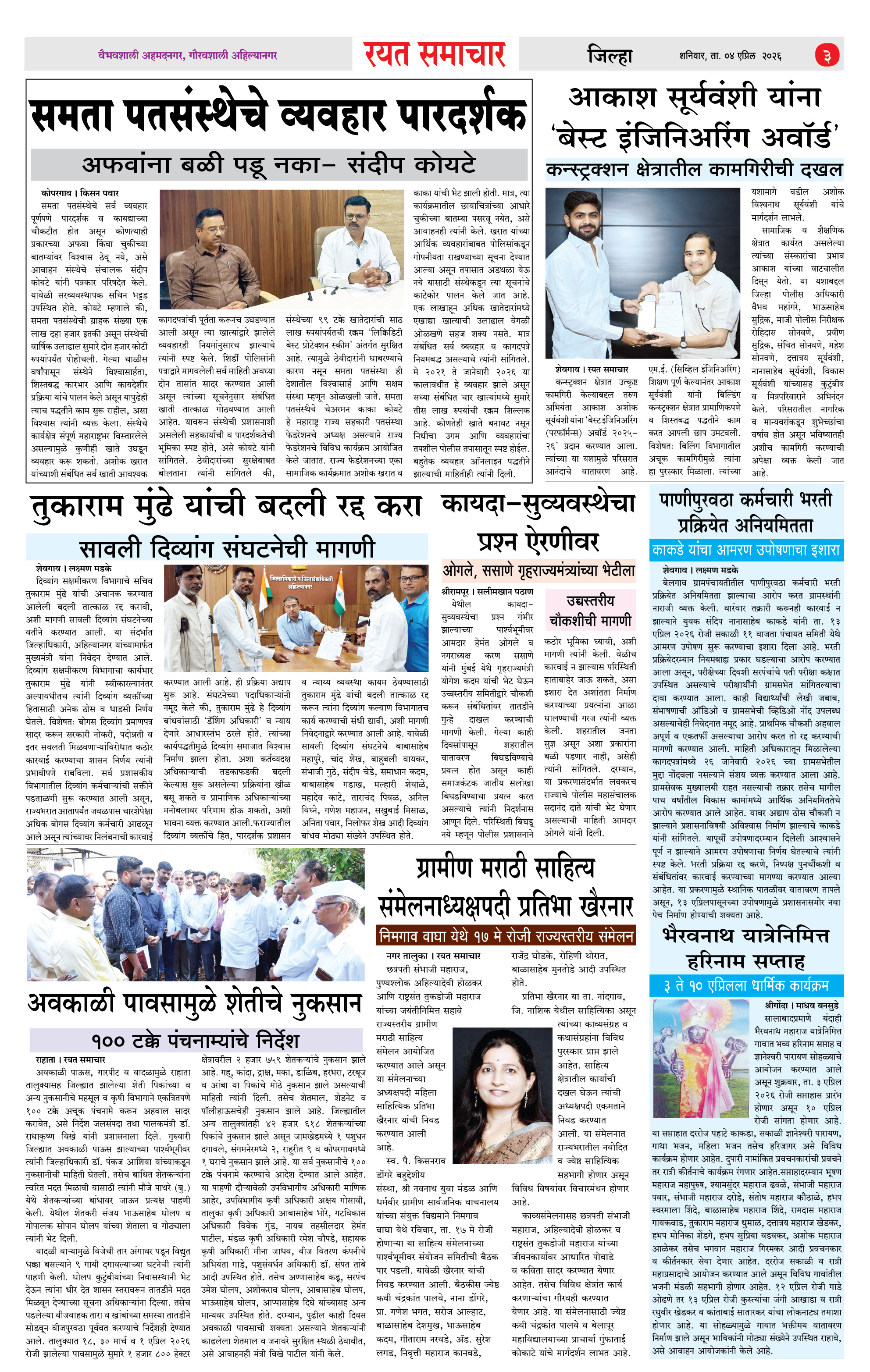 RSE: आजचा रयत समाचार वाचा 04 April 2026 मनोरंजनासह प्रबोधनासाठी Page: 3 April 04, 2026 << First << 1 2 3 4 >> Last >> Page 1Page 2Page 3Page 4 × RSE: आजचा रयत समाचार वाचा 04 April 2026 मनोरंजनासह प्रबोधनासाठी 1_MAIN PAGE2_CITY PAGE3_DISTRICT_PAGE4_MAHARSHTRA_PAGE << First << 3 >> Last >> 1_MAIN PAGE2_CITY PAGE3_DISTRICT_PAGE4_MAHARSHTRA_PAGE